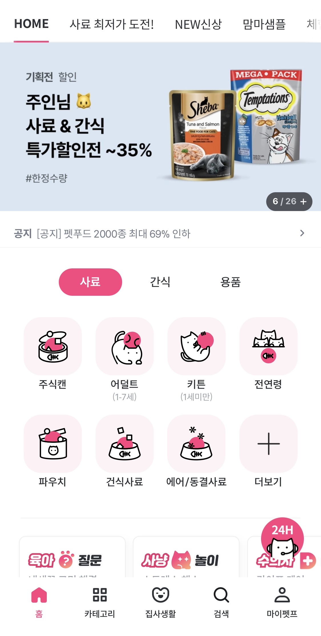 정말 다양한 카테고리가 있죠? 필수품인 사료, 모래, 캣타워뿐만 아니라 다양한 간식, 영양제등 없는 게 없답니다.