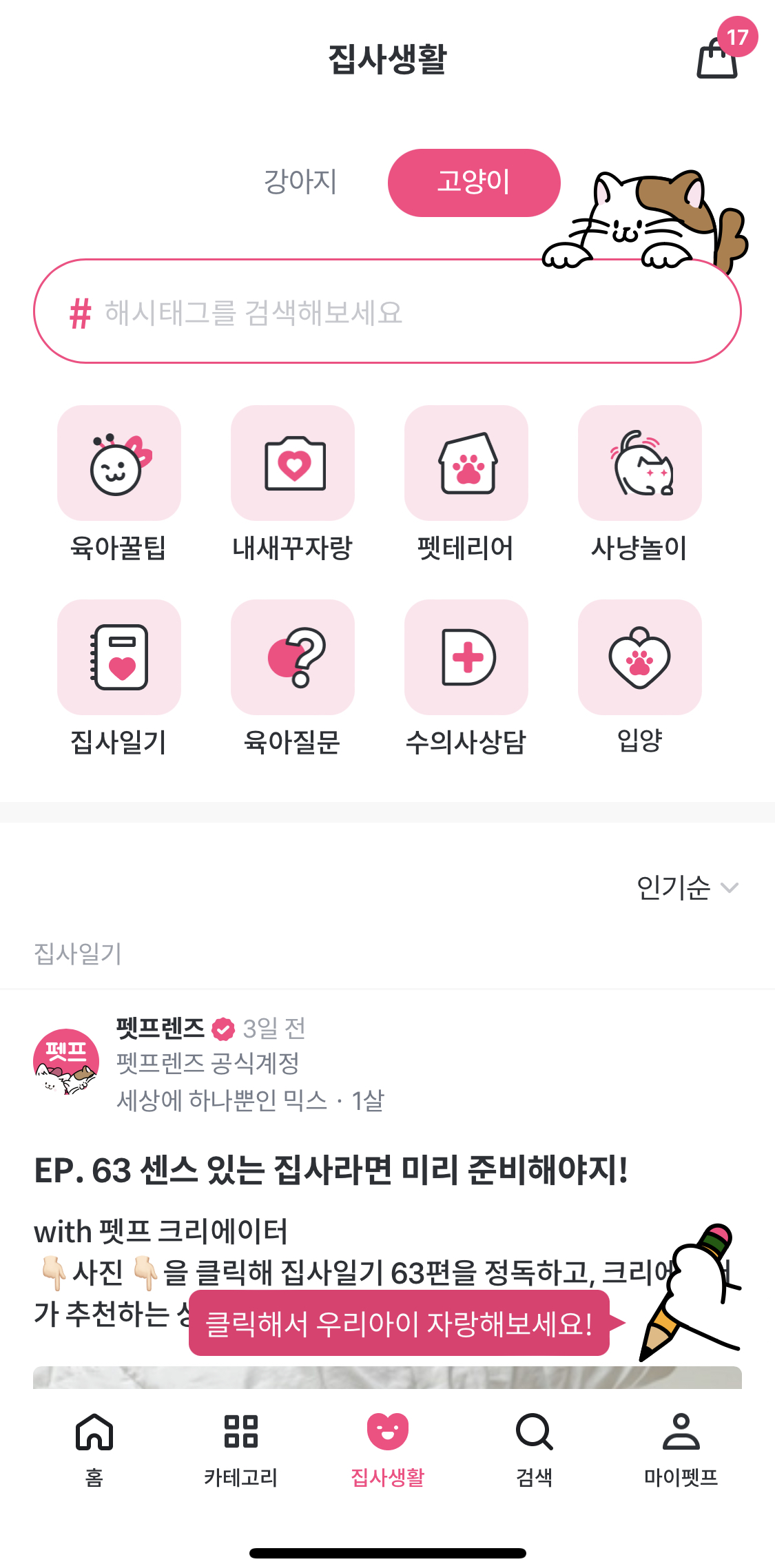 이렇게 반려동물 물품어플 1위 '펫프렌즈'는 커뮤니티도 잘 되어있습니다. 궁금한 사항이나 내가 알고있는 꿀팁들을 나눌 수 있고, 입양 공고까지 올라오니 반려동물을 키우고 있지 않아도 관심이 있는 분들 누구든 재밌게 이용하실 수 있습니다. 저는 '내 새꾸 자랑'을 자주 이용한답니다. 내 눈에는 세상 누구보다 이쁜 우리 고양이들 어디든 자랑하고 싶은 게 집사 마음이잖아요.